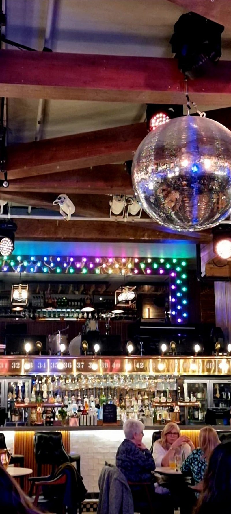 I’m not sure what gives it away, the ginormous disco ball in the middle of the room or the raised band stand above the bar. Either way, you know this is where the partys at.